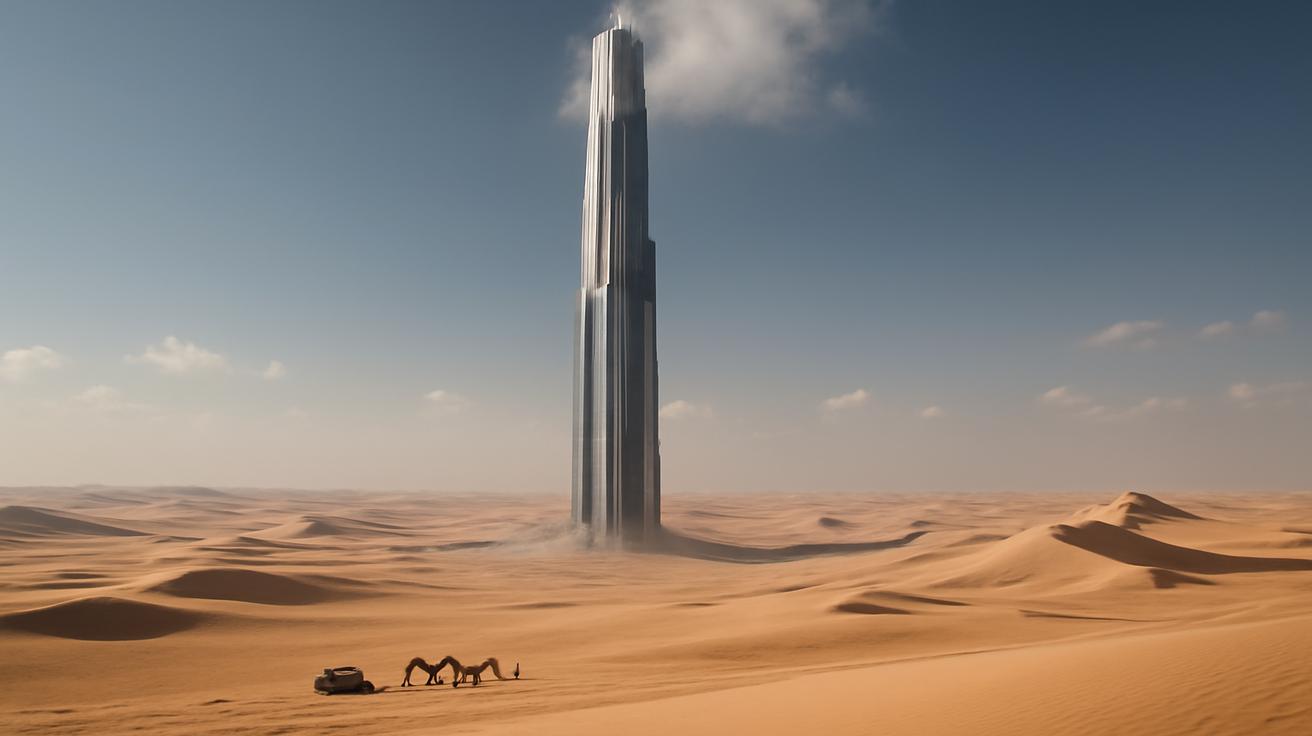 The dust arrives first. It drifts over the highway in tired curls, softening the sharp line where asphalt gives up and desert begins again. The sun hangs low and swollen, bleaching color from the sky until everything is some version of gold, or bone, or rust. Up ahead, through the shimmer of heat, something interrupts the horizon—a thin, metallic punctuation mark rising out of the sand. You squint. It looks unreal, like a glitch in a video game or a misplaced graphic in an architecture magazine. A one-kilometer needle of glass and steel, stabbed into a landscape that has survived everything except our certainty that we can improve on it.