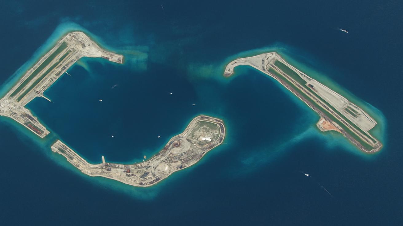 Scroll forward a year or two in time, and the shapes change. At first, there’s just a hazy ring of lighter blue as sand piles up on the reef. Then a crescent appears, then a blob, then something unmistakably geometric. Shorelines straighten as bulldozers push wet sand into neat edges. Before long, you can trace the sharp outline of a runway, the crisp grids of roads, the silhouettes of hangars and communication towers. Step by step, a map is rewritten.