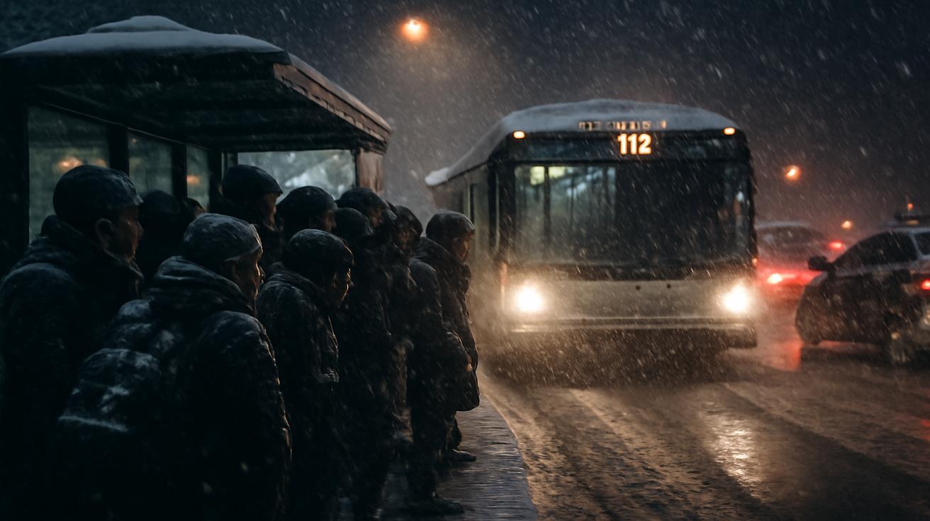 Down the block, a delivery van coughed to life, tailpipe puffing little ghosts of exhaust into the blizzard. A bus lumbered past, headlights throwing thick beams into the swirling storm, not so much illuminating the road as carving out a tunnel of visibility in the chaos.