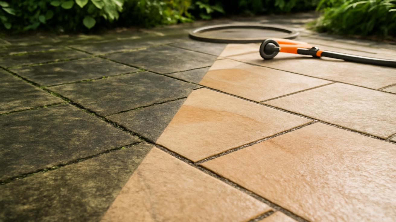 | Oxygen bleach & warm water | Heavily blackened patios, algae-rich shaded paths | Very low (apply, wait, light rinse/brush) | Overnight to 24 hours |