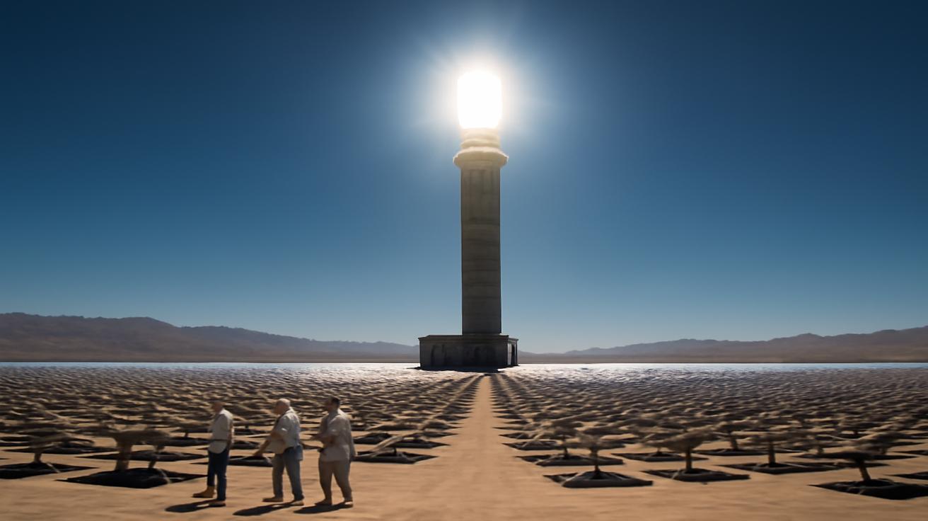 On certain days, the sky is so intensely blue it feels artificial. The air tastes of dust and metal. A warm wind runs its tongue over mirrors the size of billboards, polished so bright they seem not to reflect the sky but to carve holes in it. These are heliostats—sun-following mirrors that pivot through the day, tracking the arc of light like a field of silver sunflowers.