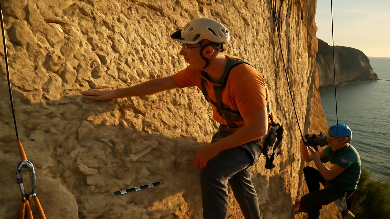 There’s an odd, poetic symmetry in the role of the rock climbers here. They came for vertical adventure: the scrape of chalked hands on rough limestone, the swing of ropes, the thrill of exposure high above the ground. What they found instead was time, layered and lifted, their route threaded across the remains of an ancient sea.