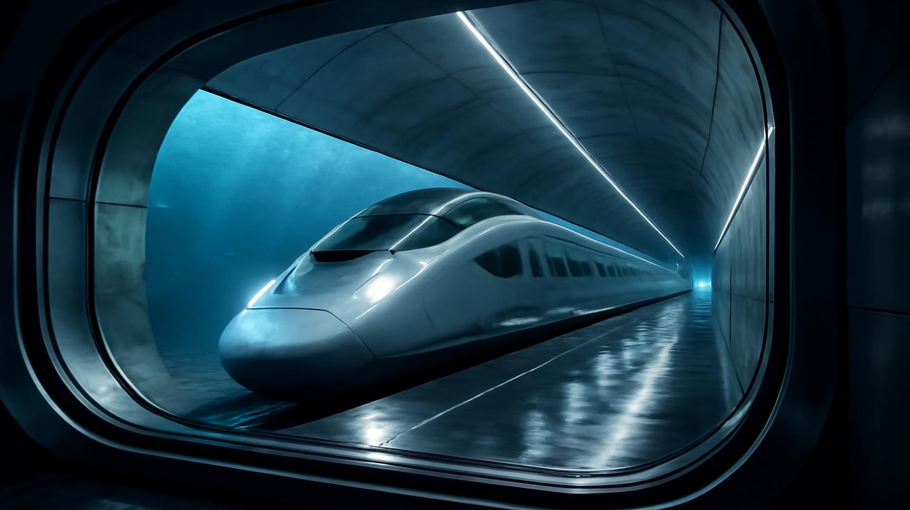 The ocean above your head is dark, cold, and heavy—millions of tons of water pressing down in quiet, crushing blue. Somewhere in that stillness, a school of silver fish wheels and scatters, the pulse of their bodies sending faint ripples through the deep. And then, from far away, a new vibration arrives. It isn’t whale song or the distant churn of a ship’s propeller. It’s a low, steady hum, the sound of something no human has ever ridden before: a train—sleek, electric, impossibly fast—sliding through a hollow artery beneath the seafloor, stitching two continents together in minutes.