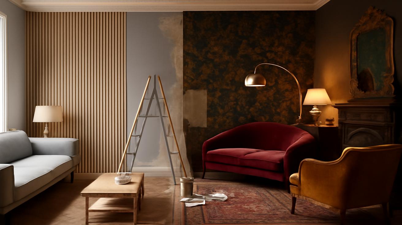 Start with loose pieces. A vintage coffee table, a second-hand lamp, an old mirror—these can instantly take the focus away from a dominant wall treatment. Next, play with textiles: swap slick cushions for velvet, linen, or tapestry-style fabrics. Bring in a rug with visible age, or curtains with a slightly heavier, more traditional drape.