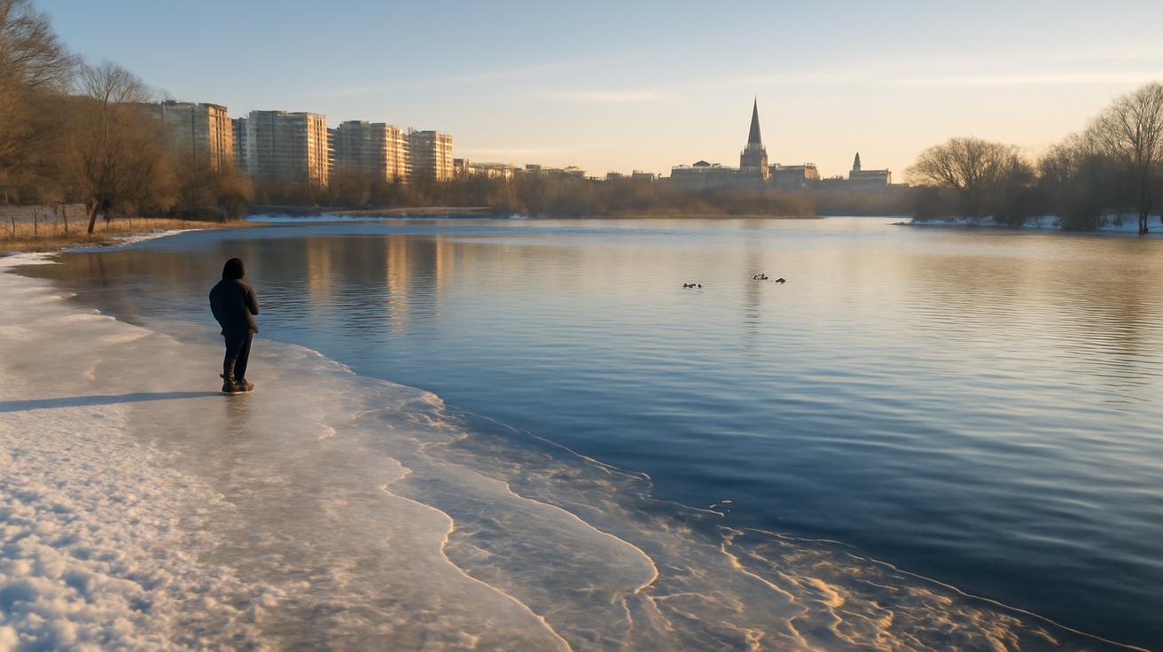 The first thing you noticed was the sound. Not the crisp, storybook crunch of ice under boots, but a softer, more hesitant crackle—like cellophane being folded in slow motion. You had walked down to Lake Créteil in the clear, bright cold of the afternoon, expecting the water to be either fully frozen or not frozen at all. Simple. Obvious. But standing on the shore you saw something that didn’t fit that neat picture at all: a stubborn white collar of ice hugging the edges of the lake, while the middle shimmered with dark, rippling water, free and moving under the winter sun.